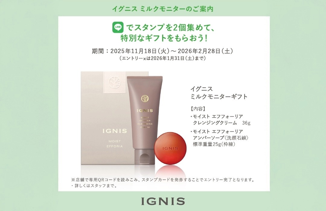 期間中、同一店舗でイグニスの乳液を2回ご購入の上、