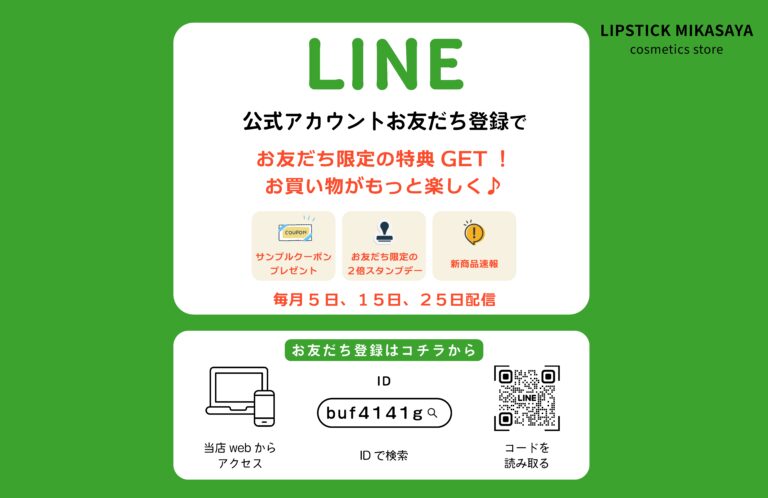 いつもリップスティックみかさやをご愛顧いただき、誠にありがとうございます! 本日、10月15日(水) は2ヶ月に1度のLINE会員さまへの感謝を込めた特別企画 『お友だち2倍デー』 を開催いたします♪ 営業時間は通常通りの09:30〜19:30です! 当日は LINEクーポン画面をご提示いただくだけで、スタンプを2倍 お付けいたします🎁 ささやかではありますが、いつもご利用くださる皆さまへの感謝の気持ちを込めて♪ どうぞお買い物のひとときをお楽しみくださいませ☺️ 配達も承っておりますので、お電話・LINE・お問い合わせフォームでお気軽にお問い合わせ […] -