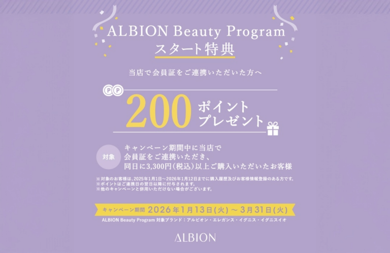 2026年 1月13日(火)スタート!!【ALBION Beauty Program】はじまりました💄✨ 「ポイントが貯まるって聞いたけど、どういう仕組み?」「マイページ登録って難しそう…」「なにか面倒なことしないとダメ?」 そんな不安や疑問に思っている方に朗報です📣すべて、”LIPSTICK MIKASAYA”にお任せください!! ✔ 当日ご購入がなくてもOK✔ フラッと来て「ちょっと教えてほしいんですけど・・・」で大丈夫✔ 登録も操作も、スタッフがその場で丁寧にサポートします✨ もちろん、 […] -